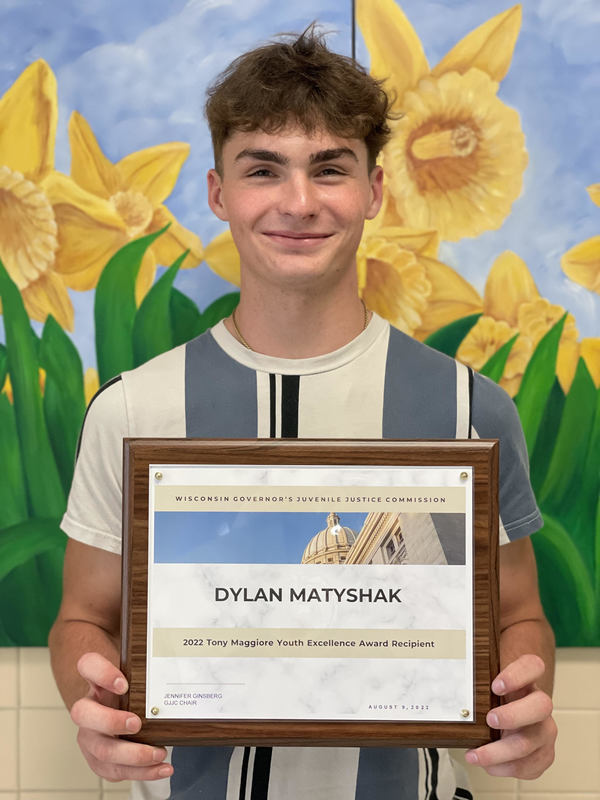 On August 9th, 2022, Dylan Matyshak was awarded the "2022 Tony Maggiore Youth Excellence Award." This award is given to a youth that demonstrates perseverance and determination. Dylan was nominated by Mrs. Reckelberg after she saw his transformation upon graduation from The Challenge Academy. This award recognizes a youth person, having prior contact with the juvenile justice system, that has achieved personal success and has made positive contributions to their community. Dylan Matyshak graduated from Denmark High School in 2022 after completing programming for 6 months at the Wisconsin National Guard Challenge Academy. Dylan was given the award from Governor Evers himself, congratulating him on overcoming adversity and making positive changes in his life.
