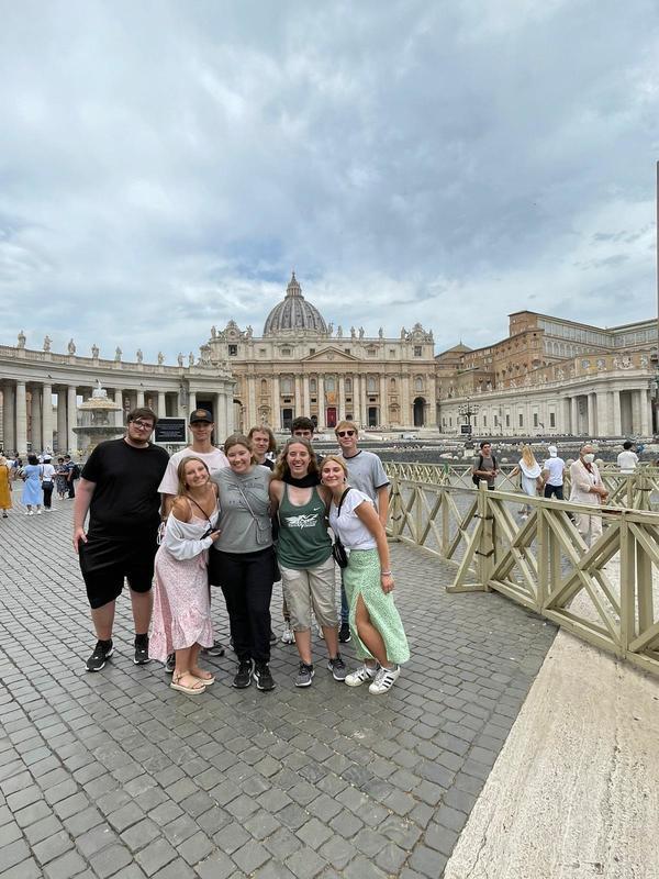 Visiting the Vatican City: Nathan Frutig, Logan Godlewski, Megan Levy, Hannah Nelsen, Owen Petrich, Ethan Schroeder, Lauren Schroeder, Dana Ullman, and Mark Wanek.